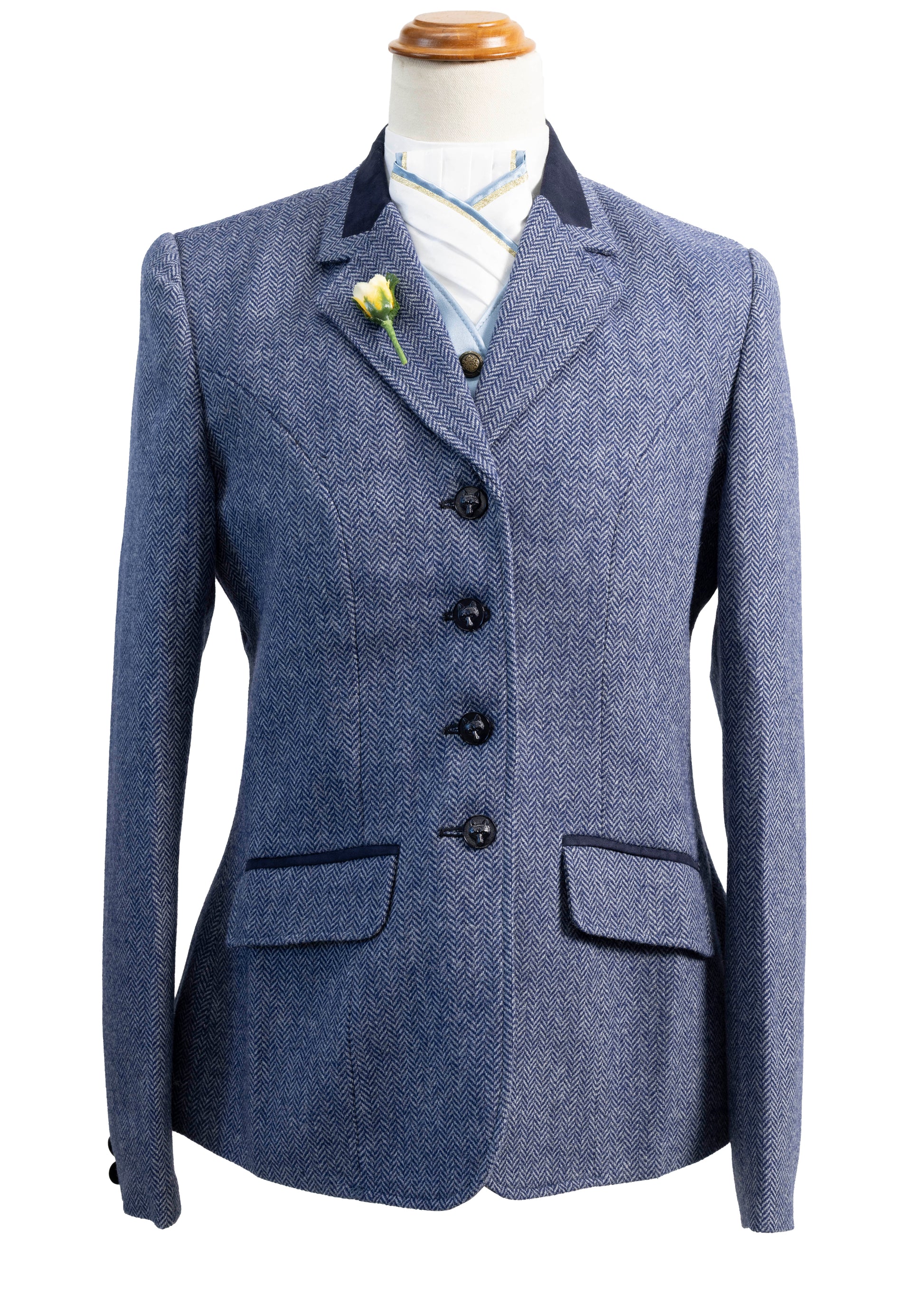 This quality ladies' jacket is crafted from midweight pure wool in a classic navy and silver herringbone pattern, offering both elegance and timeless style.