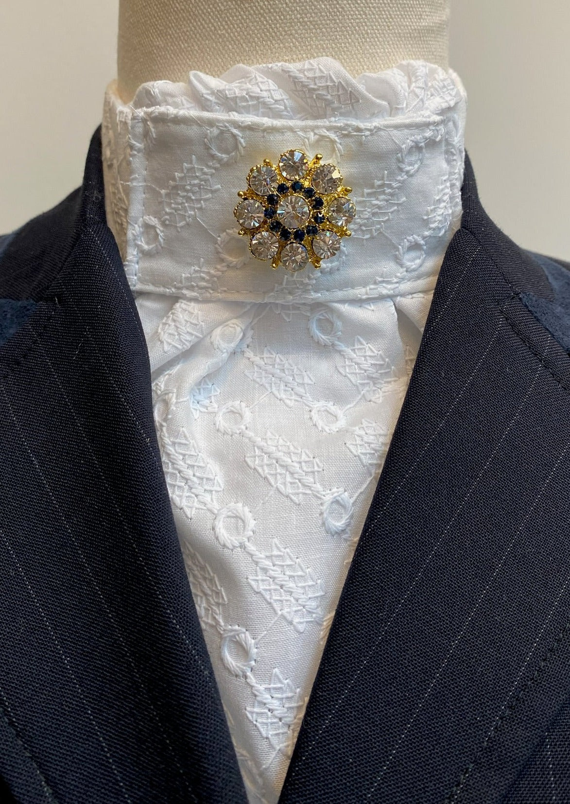 Embroidered white cotton with a large diamanté pin set with small navy diamanté